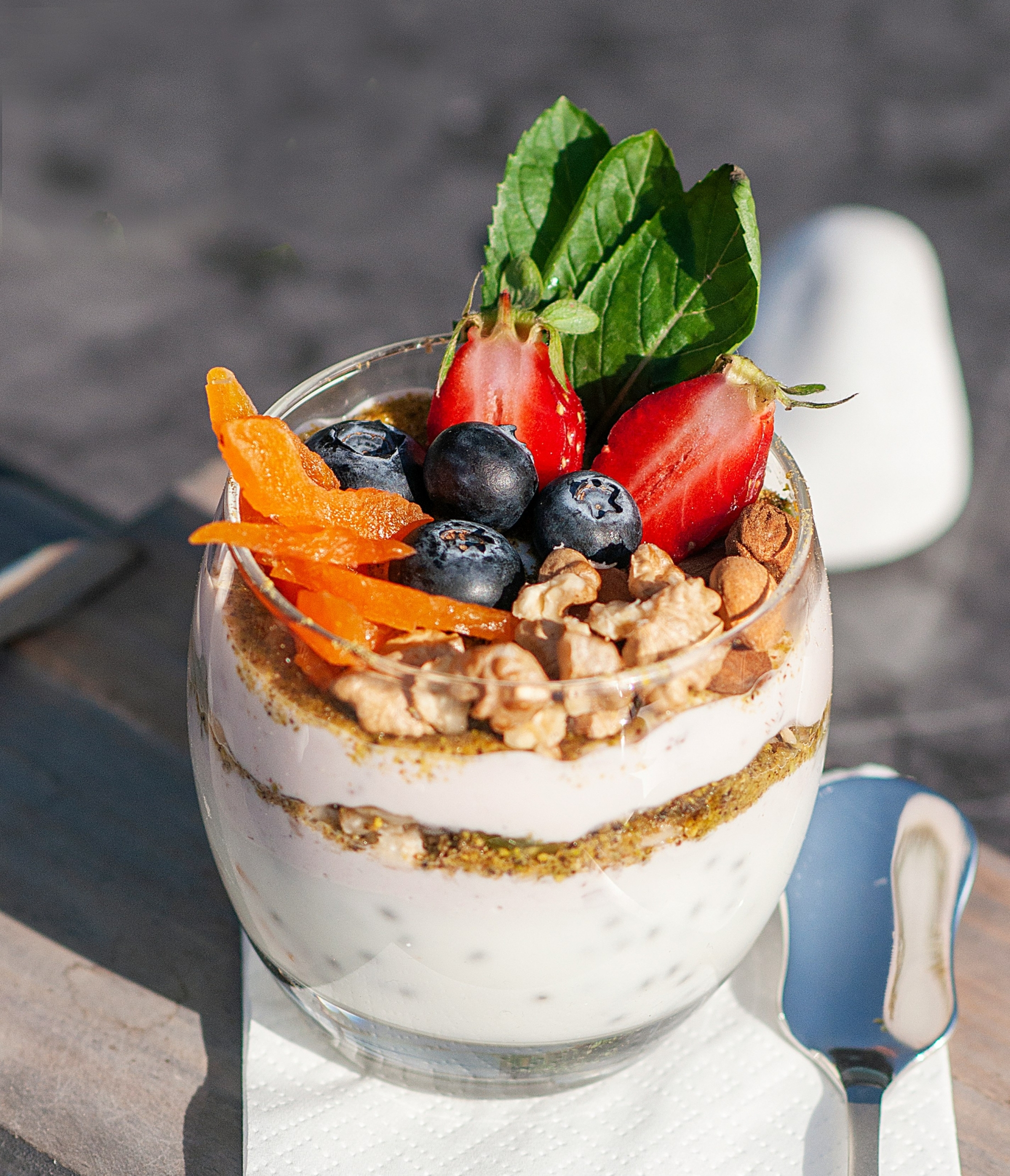 - Pour 1/2 cup of yogurt mixture in the bottom of a glass bowl.