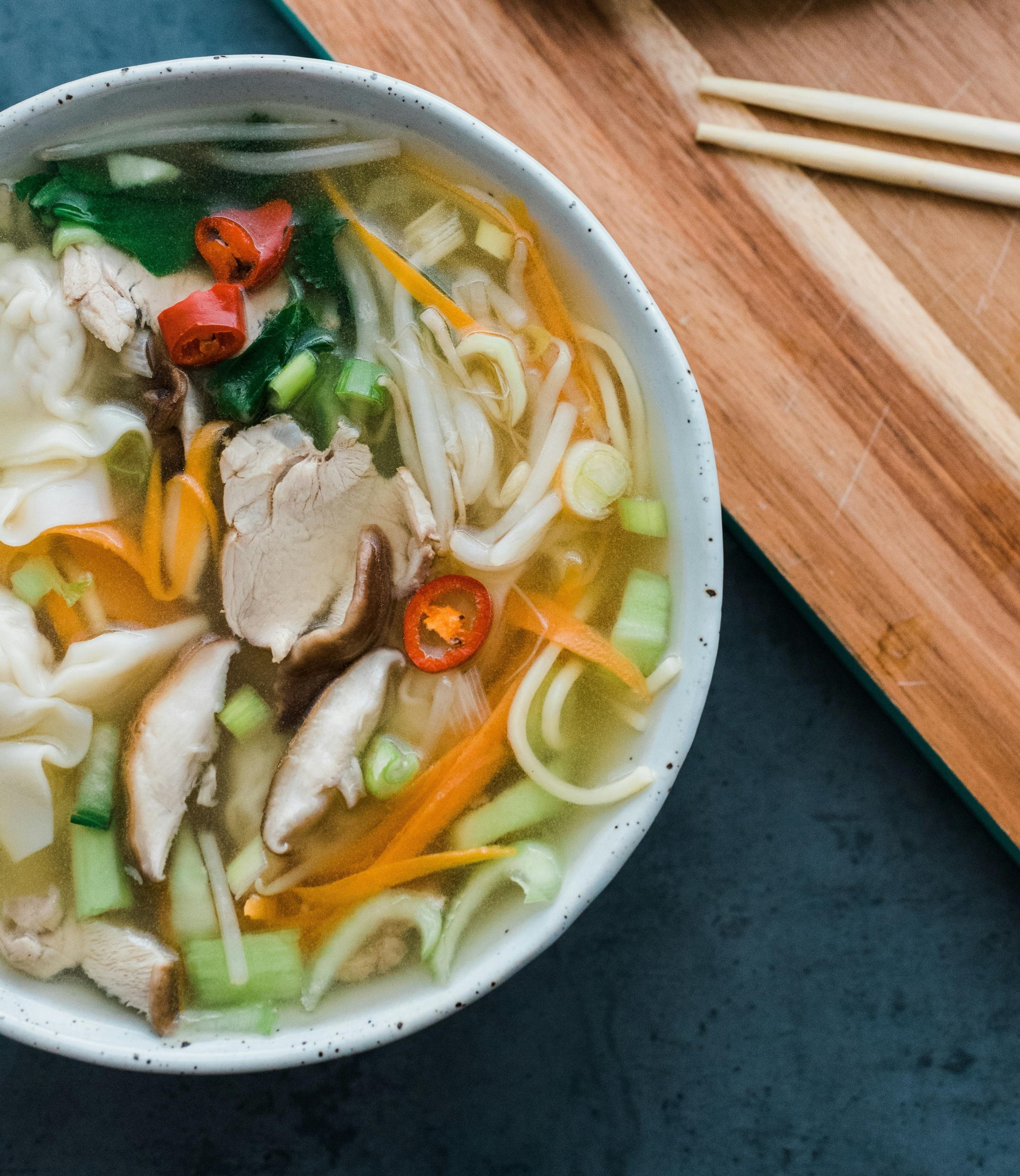 A hearty, spicy chicken noodle soup loaded with leeks, carrots, celery, broccoli, garlic, and red pepper flakes for a comforting bowl with extra warmth and flavor.