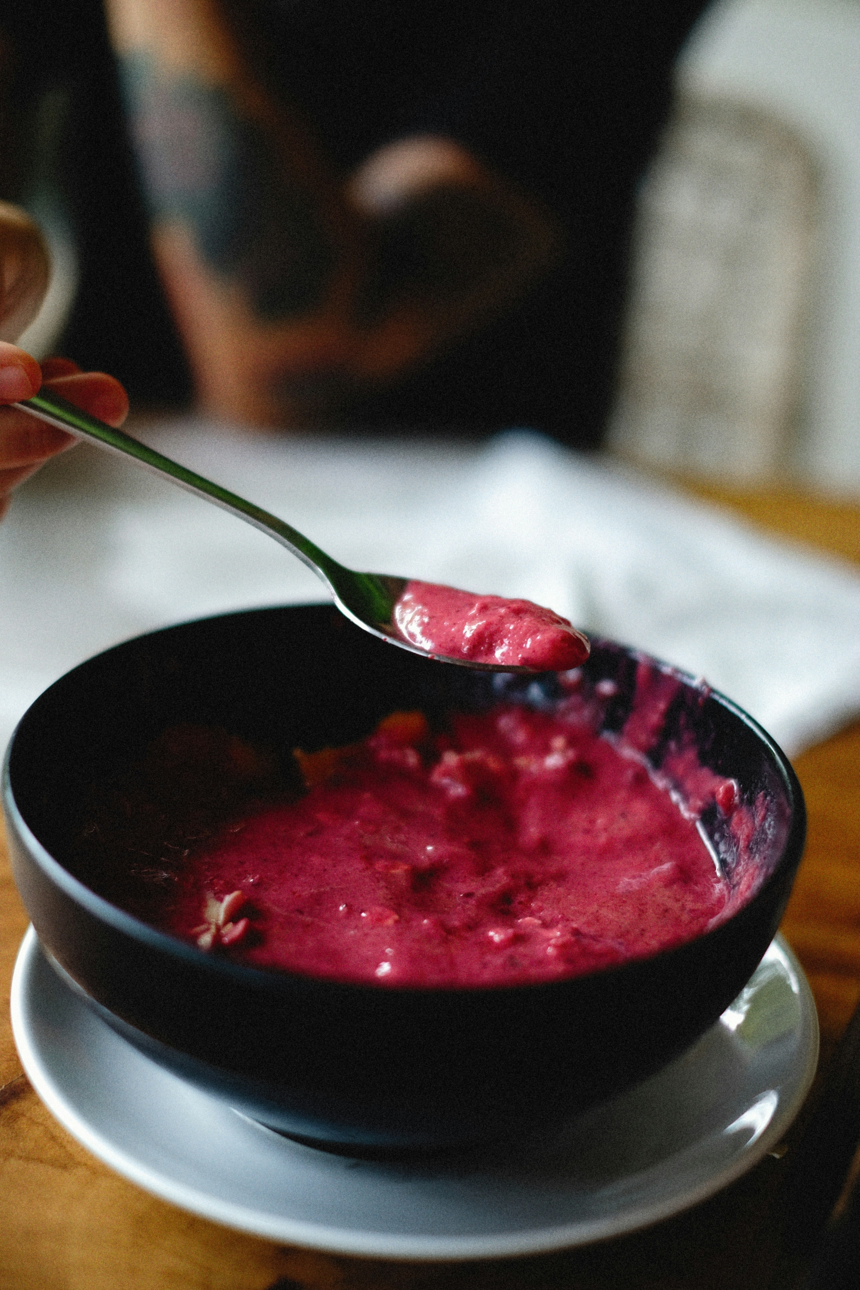A smooth and refreshing chilled cherry soup blended with orange, sour cream, and yogurt for a creamy, fruity dessert or starter served cold.