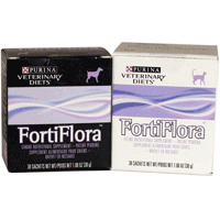 Probiotics are bacteria that promote well-being by improving the general environment of the intestines and decreasing the adherence of pathogenic bacteria in the GI tract. These “good germs” provide an environment that is unfavorable for the colonization and survival of pathogens or “bad germs” in the intestines. Veterinarians use probiotics for numerous situations. The most common indication for a probiotic is diarrhea, whether acute or chronic. We also commonly use them when pets are on antibiotics (which can alter the normal healthy bacterial flora of a pet’s GI tract). Probiotics can also be indicated for pets with kidney disease. Various brands of probiotics for pets come in pastes, powders, capsules and tablet form. I think Purina Fortiflora is the easiest to administer of the probiotics for dogs and cats because it is sprinkled onto the pet’s food. Furthermore, the flavor has been shown to be highly palatable to most pets. While some companies make probiotics that are meant for either dogs or cats, Purina has made the extra effort of formulating a product for dogs and a product for cats.