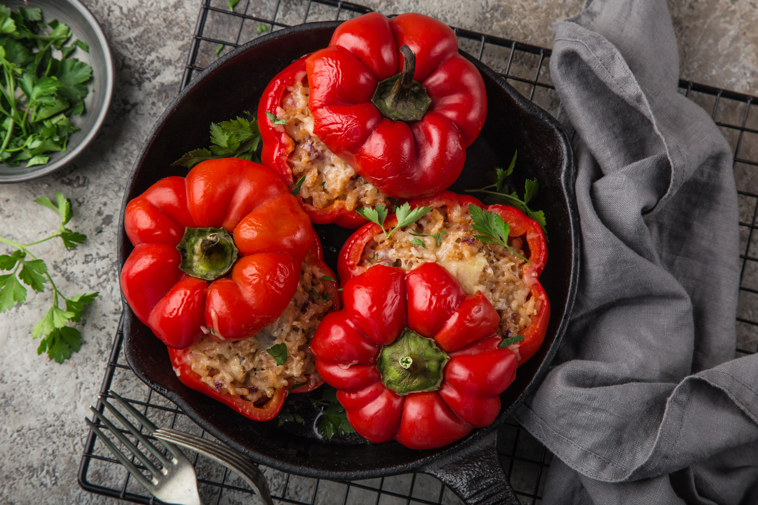 - Scoop the sautéed rice mixture into bell peppers and place in oven to warm peppers about 10 minutes.
