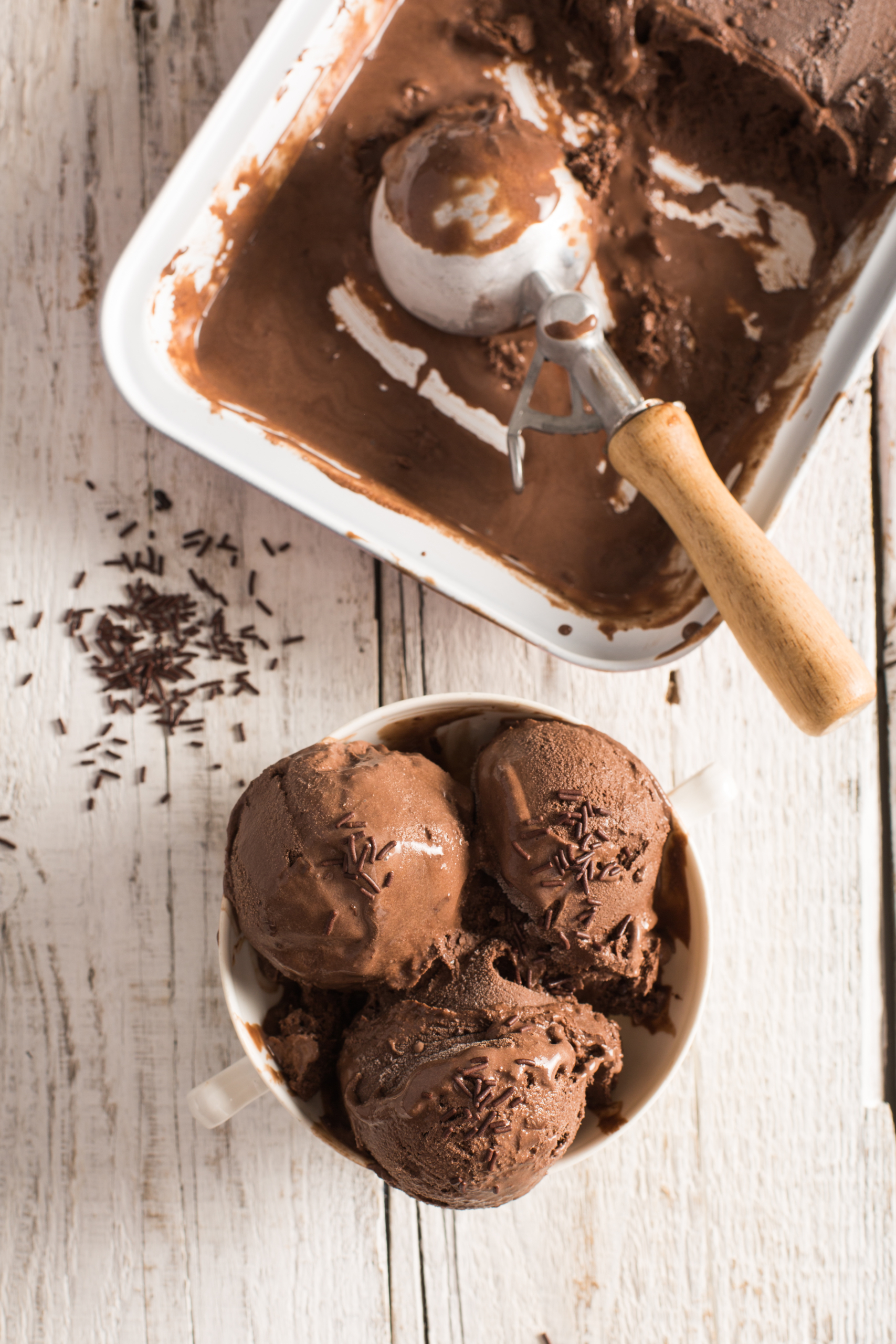 A rich and creamy chocolate ice cream made with cocoa, cream, eggs, and sweetener, chilled and churned until smooth for a classic frozen dessert.