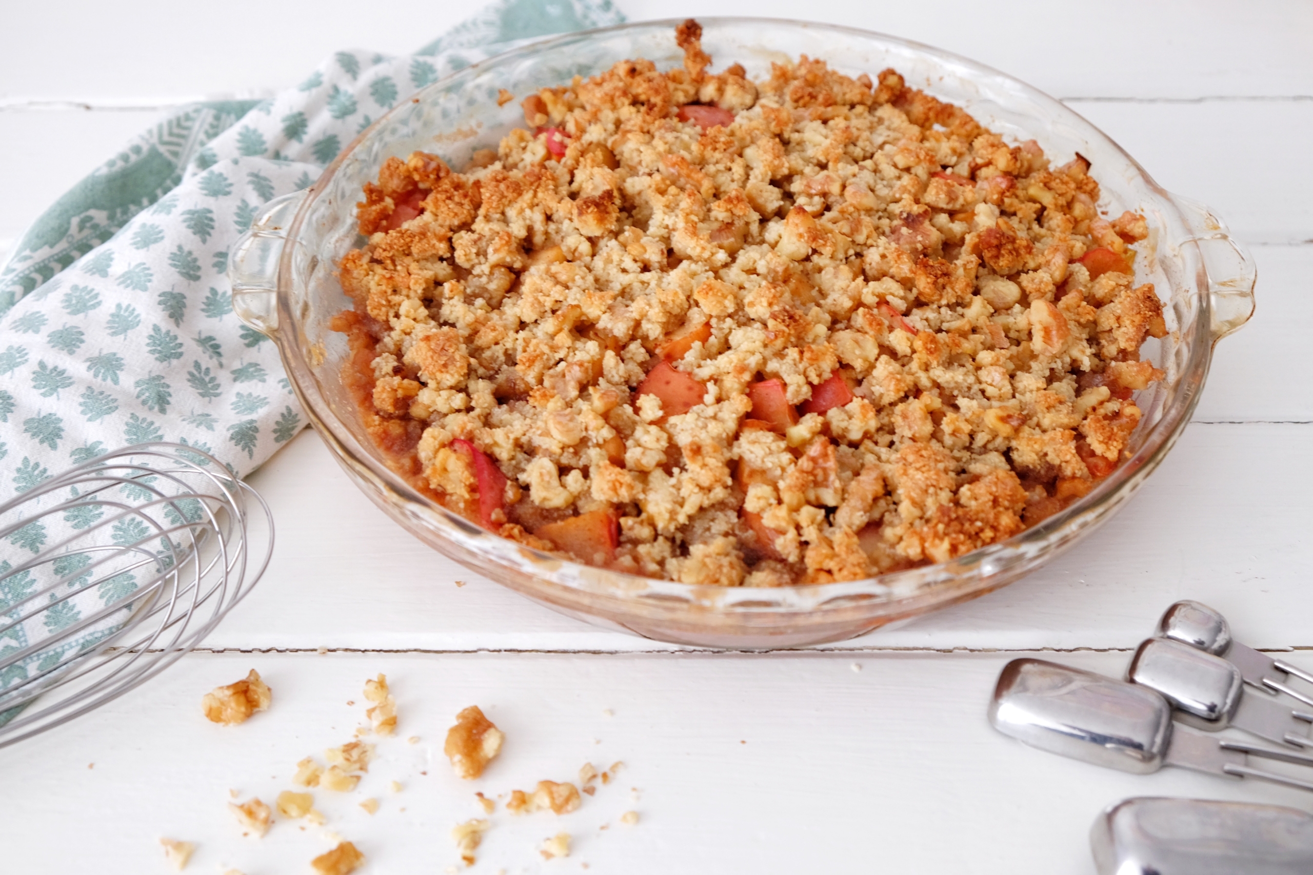 A warm apple-rhubarb fruit bake topped with a buttery oat, raisin, and nut crumble, baked until tender and crisp for a comforting dessert.