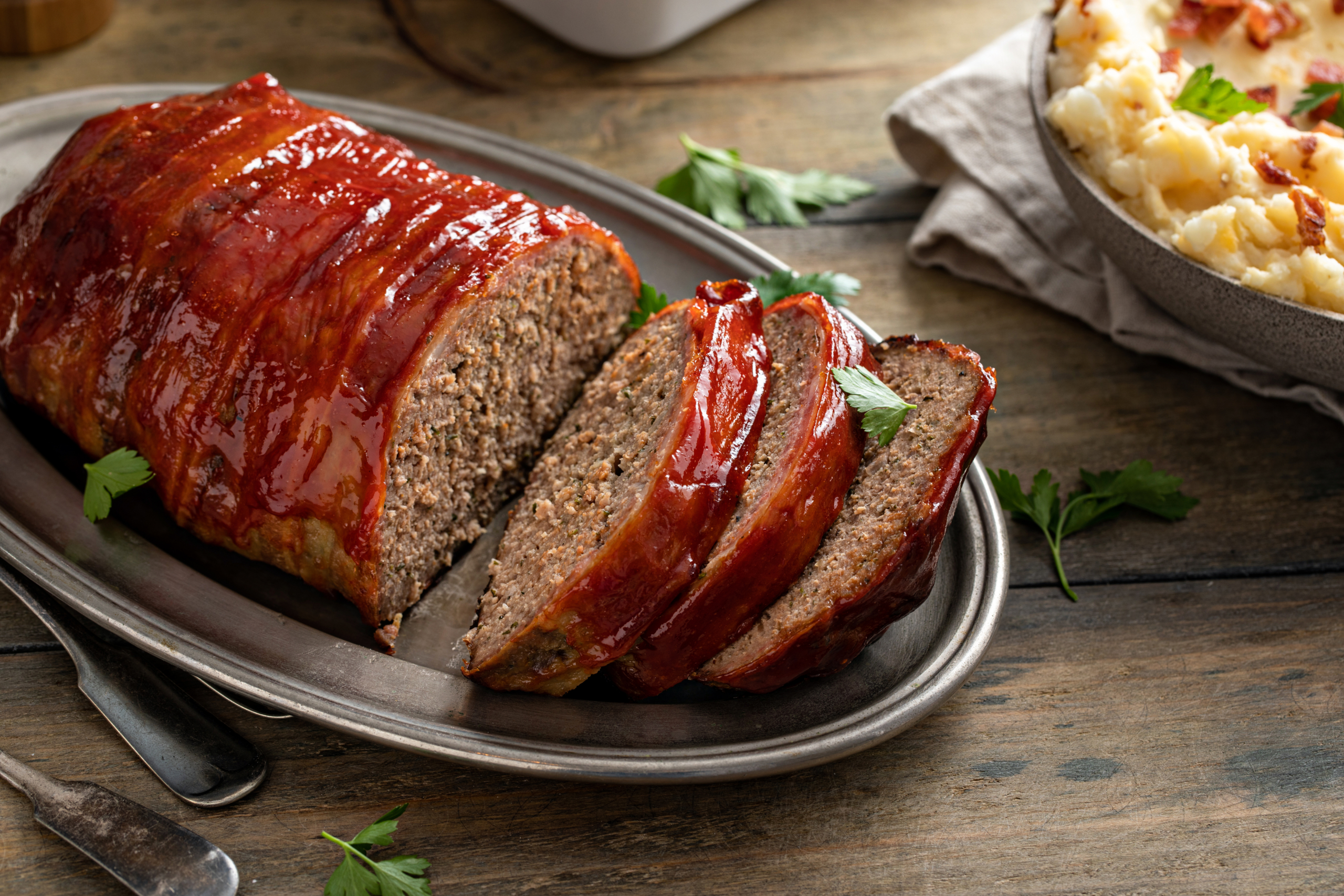 A classic homemade meatloaf made with seasoned ground beef and topped with a tangy sweet tomato-mustard glaze, baked until tender and flavorful.
