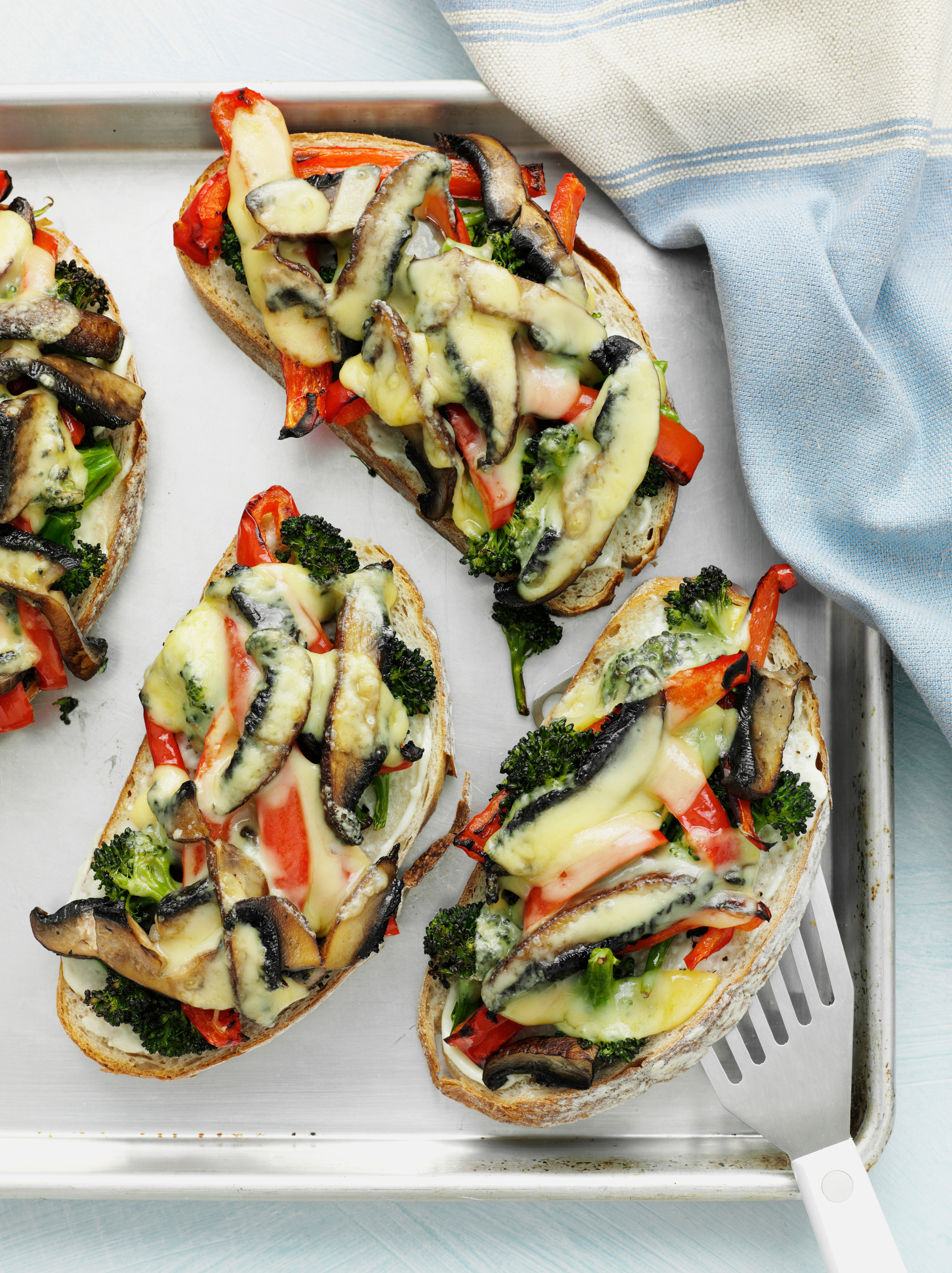 - Top bread evenly with tomato slices, onion rings, mushroom slices, green pepper strips, red pepper strips, and broccoflower.