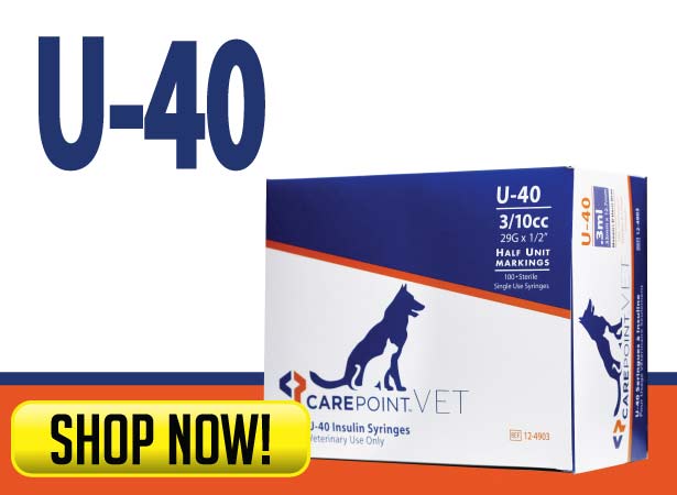 CarePoint vet insulin syringes and pen needles offer supreme comfort for your diabetic pet. The syringes are offered in both U-40 and U-100 sizes and 3/10cc, 1/2cc, 1nd 1cc capacities to accommodate every kind of insulin currently being used to treat pets with diabetes. CarePoint Vet syringes and needles offer specially lubricated needles that are designed to offer a comfortable injection experience. These needles are available in a wide range of gauges and lengths allowing you the ability to choose the best syringe and needle possible to administer insulin for your pet.