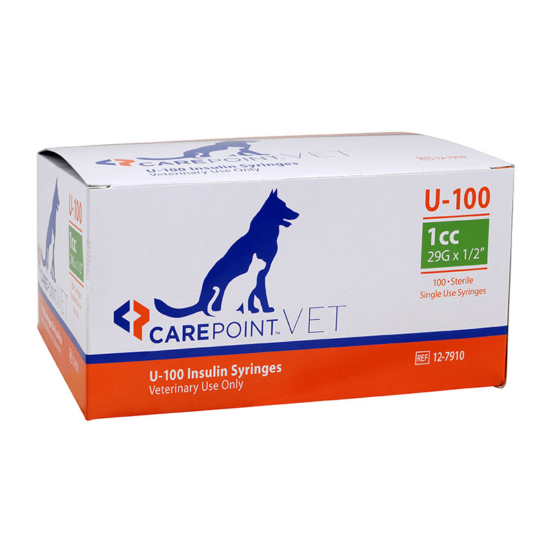 CarePoint Pet U-100 Syringes 29G 1cc 1/2" Box of 100, model #12-7910 for dogs and cats.
