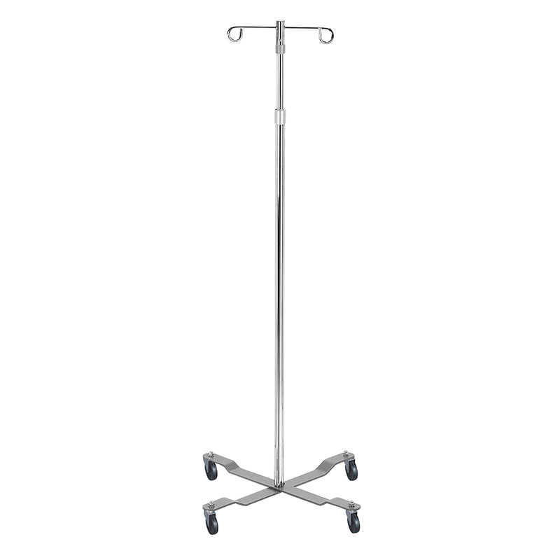 Removable hooks on this economy 4 hook IV pole (in chrome) by Drive Medical speak to its versatility. With easy push-pin release, it converts between a 2-hook and 4-hook top. (Product is available in 2-hook and 4-hook form.) Chrome-plated steel with weighted base provides strength and durability, while, most importantly, reducing the risk of tipping. A locking collar allows for simple height adjustment to the stem and four rubber wheels ensure smooth transportation and maneuverability.