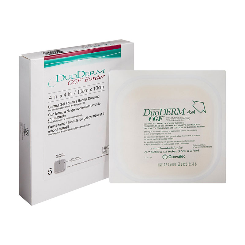 You are viewing Convatec Duoderm Cgf Control Gel Formula Border Sterile Dressing 4" X 4" Duoderm Cgf Dressing Plus 3/4" Adhesive Border - 5 Dressings/Box by Convatec, a leading manufacturer of wound care supplies.