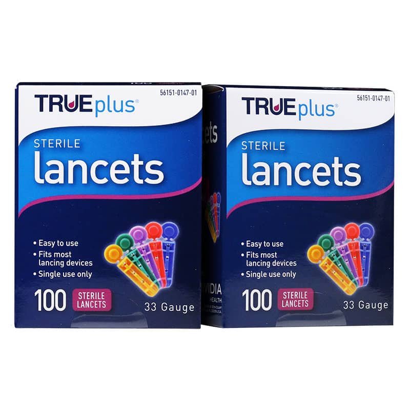 TRUEplus 33 gauge single-use sterile lancets fit most lancing devices. For your comfort, these lancets deliver smooth skin penetration. This product contains two packs of 100 True Plus 33g Lancets