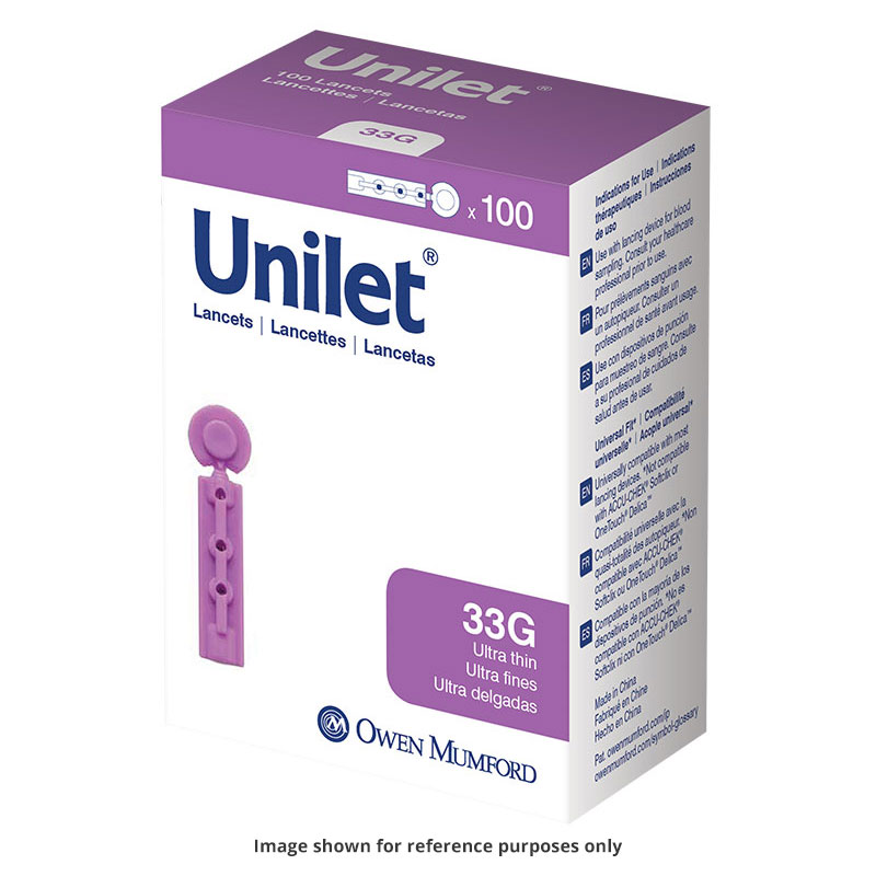 Owen Mumford Unilet Micro Thin Lancets 33G 100/bx Pack of 3 are sterile, single use lancets designed for at home capillary blood sampling.Designed for use with Autolet Lancing Devices and is compatible with most devices on the market* Available in a range of sizes to meet all patient needs.