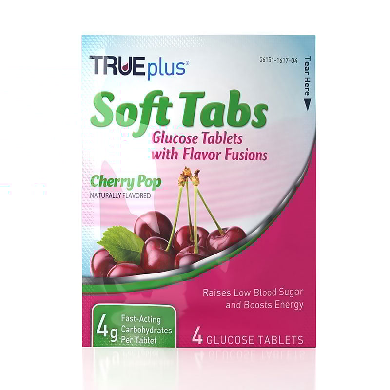 The TRUEplus Soft Tabs, Glucose Tablets with Flavor Fusion features 4 grams of fast-acting carbohydrate formula that helps raise low blood sugars and boosts energy. These tablets come in convenient packages to fit individual needs.