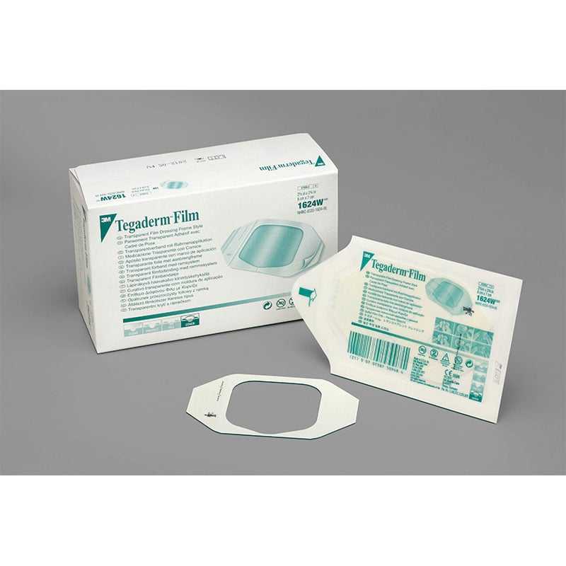 Tegaderm Transparent Dressing is a sterile, waterproof, clear, thin film dressing. Can be applied over I.V. devices, clean skin or wounds, and provides a breathable bacterial barrier to outside contaminants. 2-3/8 inch x 2-3/4 inch (6cm x 7cm) Transparent Film Dressing Frame Style. Box of 100
