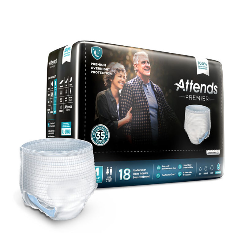 The Attends Premier Underwear Medium fits waist size 34 inches to 44 inches. This Attends line of underwear products were designed to help you or those you care for manage heavy to severe urinary and/or fecal incontinence. The high-rise, full-fit protection and ultra-plush design results in a product that fits comfortably in all the right areas. Go on the trip, walk on the beach, have dinner with your friends and family, don't let a leaks stop you from being with the ones you love. Trust in Attends Premier to protect you during the moments that matter most.