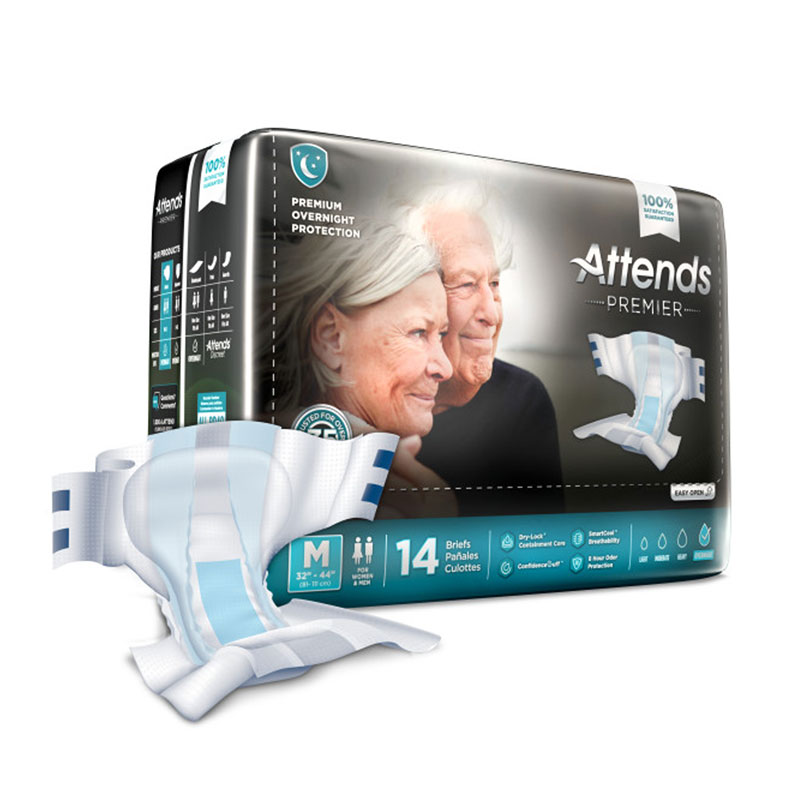 The Attends Premier Briefs were designed to help you or those you care for manage heavy to severe urinary and/or fecal incontinence. These are Attend Premier Briefs Medium which fits waist size of 32 inches to 44 inches. Attends Premier Briefs will help you feel confident that you or your loved ones are protected during the day or night. The high-rise, full-fit protection and ultra-plush design results in a product that fits comfortably in all the right areas.
