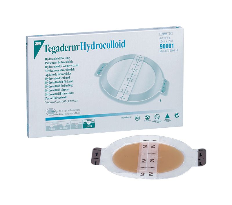 3M Tegaderm Hydrocolloid Wound Dressing is a sterile wound dressing which consists of a hypoallergenic hydrocolloid adhesive with an outer clear adhesive. Cover film ensures an optimal moist wound environment. 2.75" x 3.5"- sold by box of 5. Ref # 90001