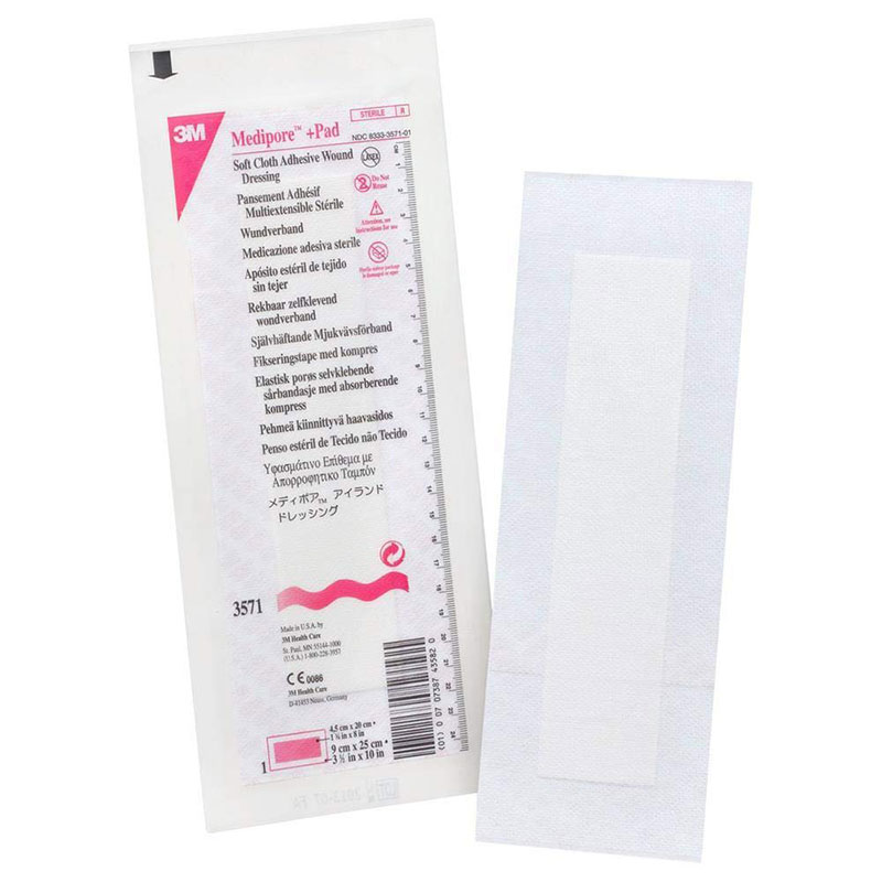 The 3M Medipore Adhesive Wound Dressing is an all in one sterile dressing that features a breathable soft cloth tape backing with a unique non-adherent pad. Sold By The Box Of 25. Ref # 3571