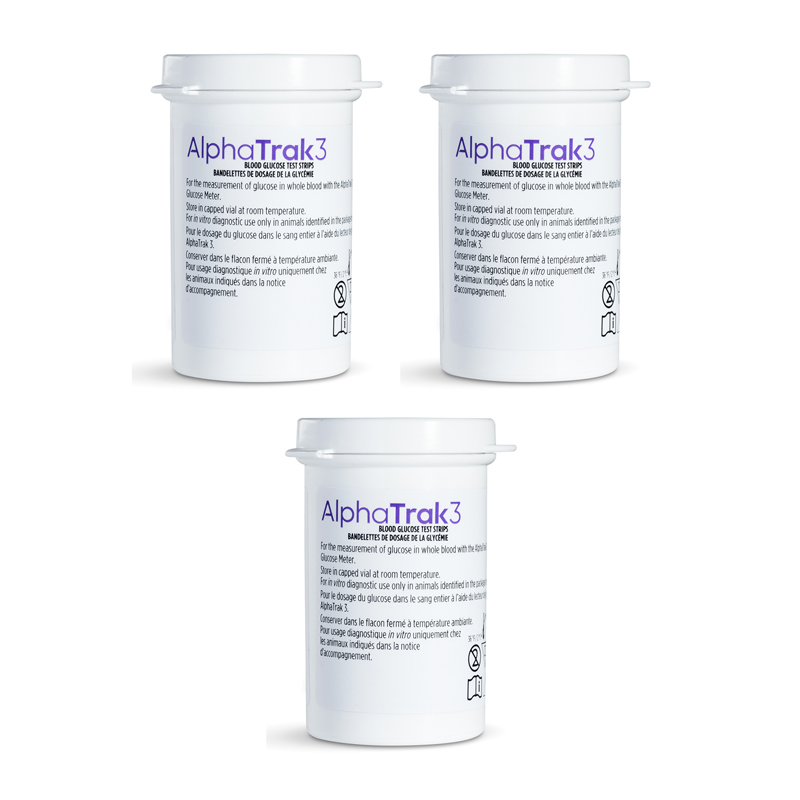 Validated for both dogs & cats, the strips feature an angled sample area for easy positioning and a sample tab design that allows for fast wicking. The easy-to-use diabetic test strips for cats and dogs require only 0.3 µL (microliters) of blood, ensuring a less painful testing experience. These strips are designed for use with only the AlphaTRAK 3 Pet Glucose Monitor.