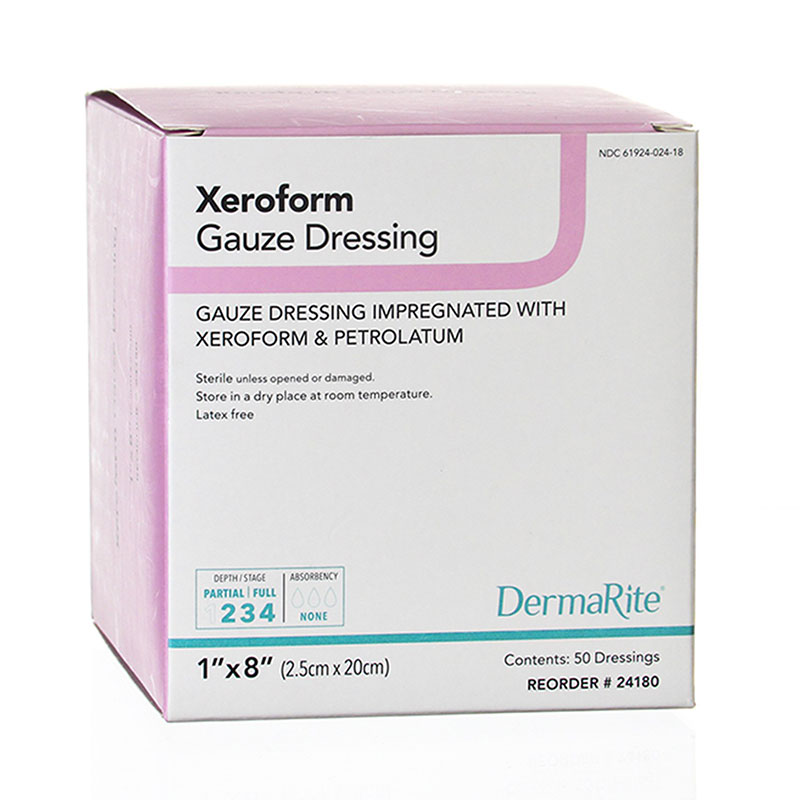 DermaRite Xeroform Dressing (1x8 inch) is a mesh gauze occlusive dressing impregnated with petrolatum and 3% Xeroform made for use on low exudating wounds.