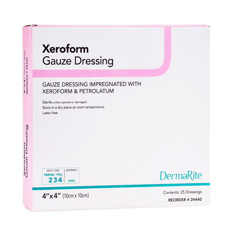 DermaRite Xeroform Dressing (4x4 inch) is a mesh gauze occlusive dressing impregnated with petrolatum and 3% Xeroform made for use on low exudating wounds.