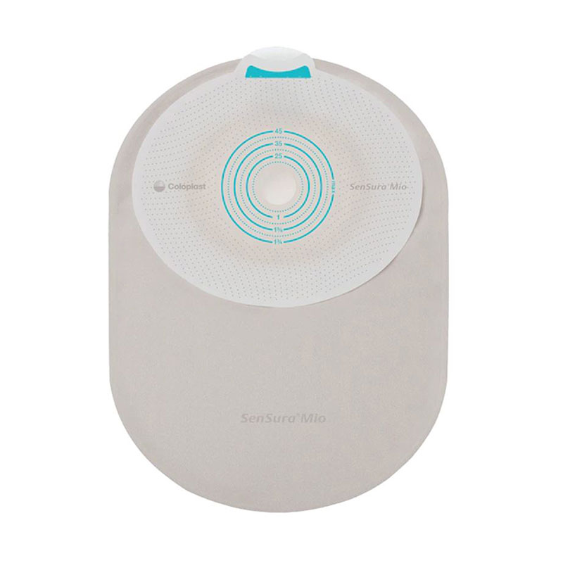 Coloplast Mio Maxi 1-Piece Pouches (Pre-Cut, 1.1875 inch) feature an inspection window and a skin-friendly adhesive with an oval shape for flexibility.
