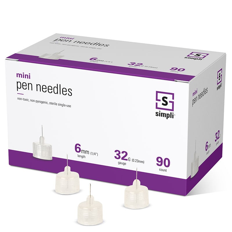 • Each Simpli Pen Needle box contains 90 sterile single-use 31G by 8mm (5/16 inch) Small pen needles