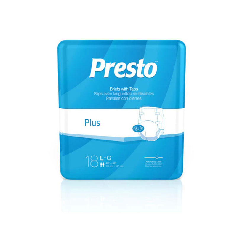 Presto Breathable Brief Value Plus Absorbency features a dual core which significantly increases the ability to wick and lock fluid away from the skin, resulting in superior performance and user satisfaction. Advanced OdorSecure Technology reduces the amount of ammonia formed in the absorbent core, preventing odors before they begin. Core is thinner and more discreet, providing a more comfortable, dignified fit. Swift and Soft advanced acquisition layer technology is the softest, highest performing acquisition layer.