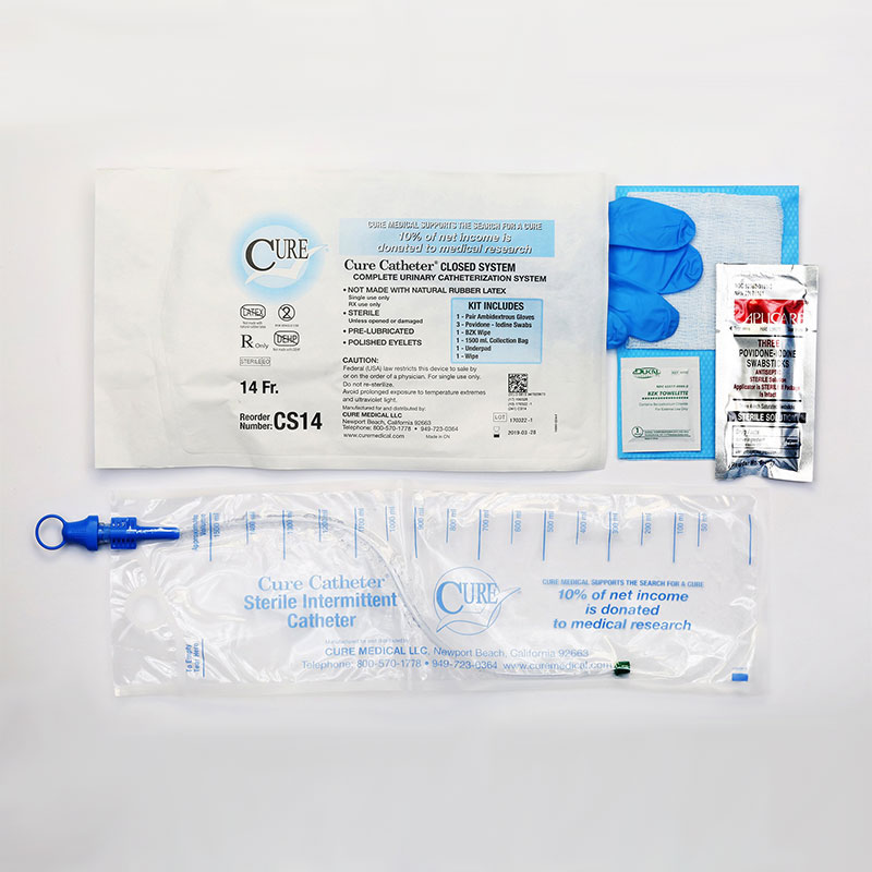 ConvaTec Cure Catheter Closed System is DEHP and Latex-free. This sterile, single-use and unisex system features polished eyelets on a straight, pre-lubricated catheter tip with integrated 1500mL collection bag offered in kit configurations. The closed system provides a simple and safe catheterization that reduces the risk of urinary tract infections (UTIs). Kits include the Cure Catheter, a non-staining BZK wipe, three Povidone-iodine swabsticks, one pair of ambidextrous gloves, a sterile wipe, and an underpad.