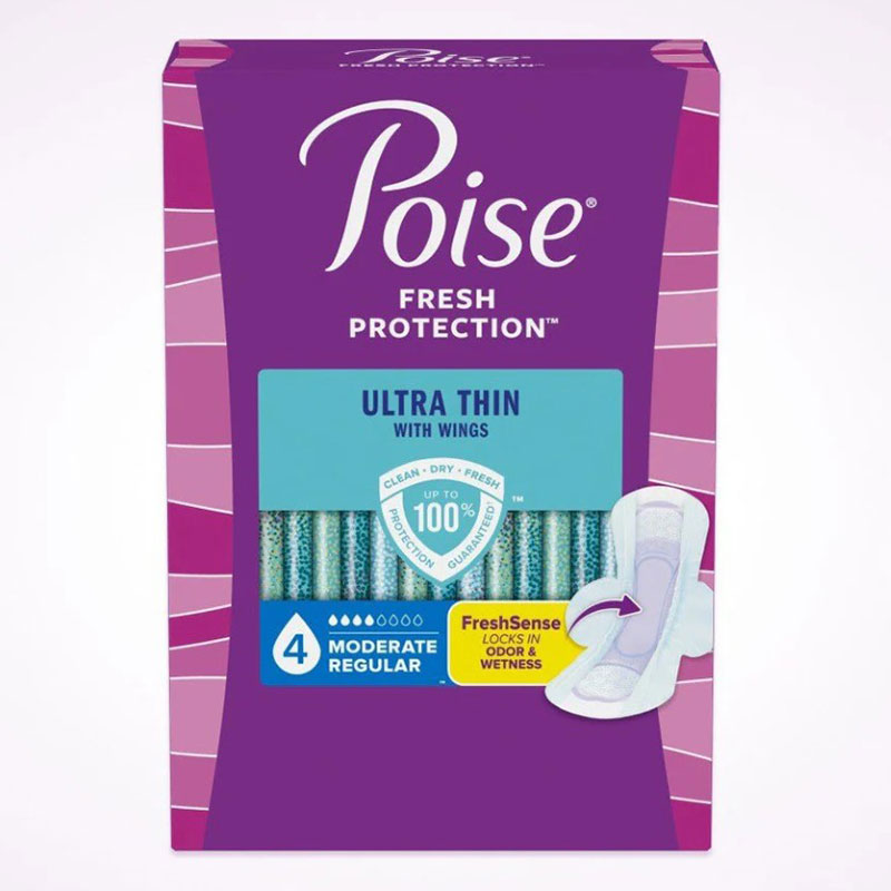 Poise Ultra Thin Moderate Wing Pads are up to 40% thinner than the original pad but still provides the trusted three-in-one protection. It stays 5x drier than the leading always period pad.