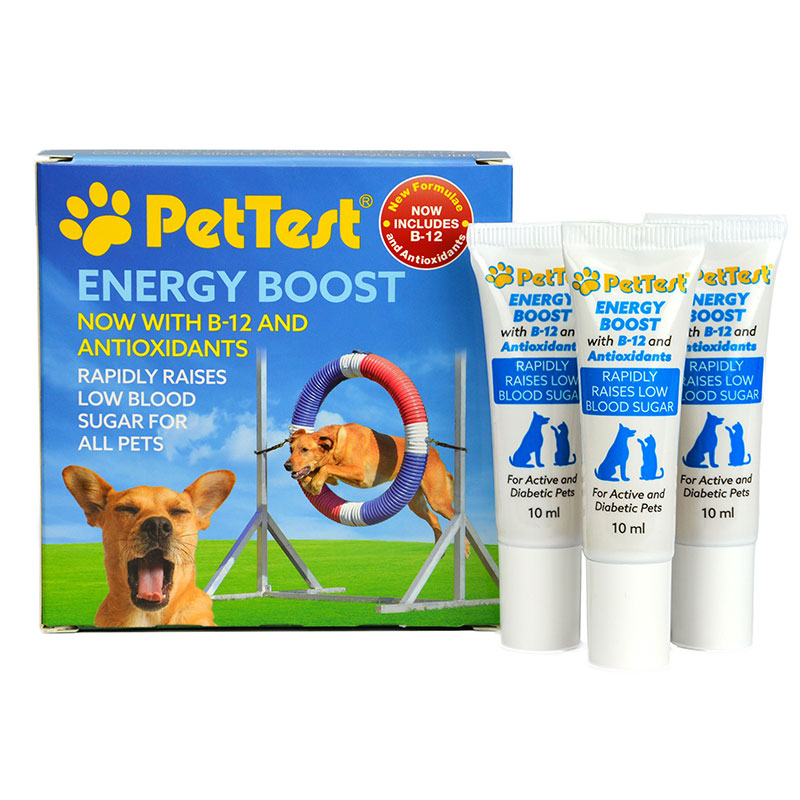 NEW AND IMPROVED PetTest Energy Boost with B-12 and Antioxidants is a fast-acting glucose product that raises your pet's blood sugar quickly and effectively.