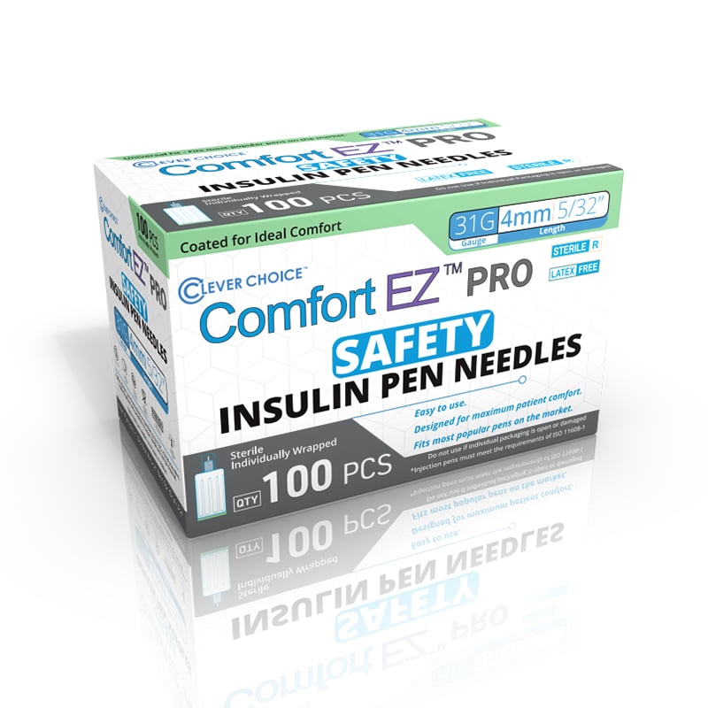 Clever Choice ComfortEZ Pro Safety 31G 4mm Pen Needles include a tri-beveled, precision-cut needle tip for a more comfortable injection experience.