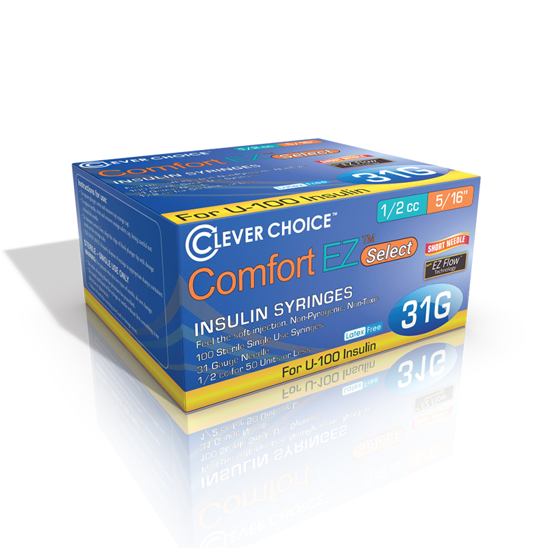 Clever Choice ComfortEZ Select U-100 Insulin Syringes are film coated for maximum comfort and line up precisely for accurate readings. There is no "dead space" for accurate dosage and less waste.