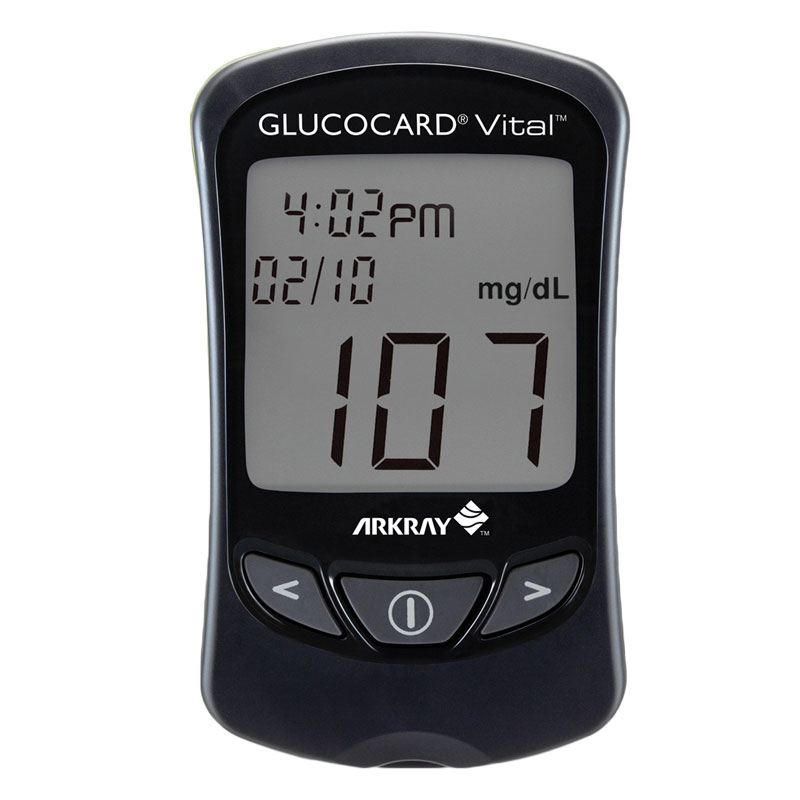 The Arkray GlucoCard Vital Blood Glucose Monitoring Kit - Black is a fast and accurate meter that makes blood glucose monitoring easy. It requires a small 0.5 µL(microliter) sample size in test strip platform to give accurate results in as little as seven seconds. This auto coded blood glucose meter has a 250-test memory to help keep track of Vitals.