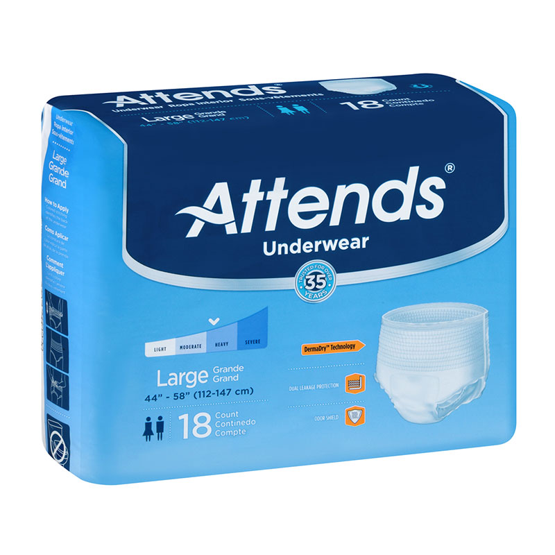 You are viewing the Attends Underwear Extra Absorbent Large 44"-58" 18/bag manufactured by Attends - a leading manufacturer of incontinence management supplies and bladder control products. We offer great prices everyday on the quality brands by Attends.