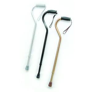 The Invacare Offset Handle Cane w/Strap Silver features an anodized aluminum finish with a soft cushioned hand grip.
