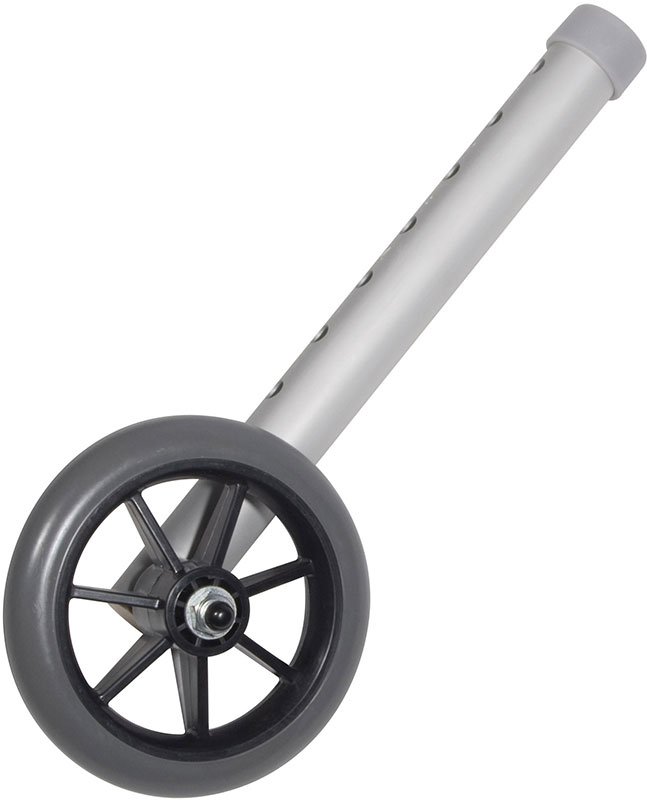 The Drive Medical Universal Walker Wheels with Rear Glides comes with 5" caster wheels and two sets of rear glides. The rubber wheels allow most walkers to roll easily and smoothly over irregular surfaces, and the rear glide caps with covers allow for use on all surface.