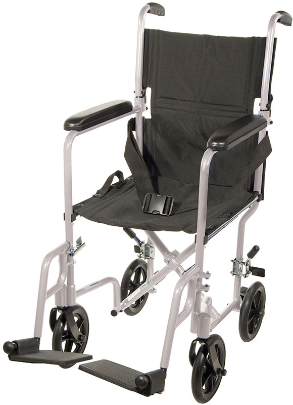 The 19" Aluminum Transport Chair in silver by Drive Medical is lightweight and strong, making it easy to transport. The black, nylon upholstery is comfortable, lightweight and easy to clean. The 8" caster wheels are lightweight, maintenance free and provide a smooth ride over most surfaces. It comes standard with swing away footrests with heel loops, padded armrests to provide additional comfort and rear wheel locks to ensure safety. Easily folds for convenient storage and transportation. Limited lifetime warranty.