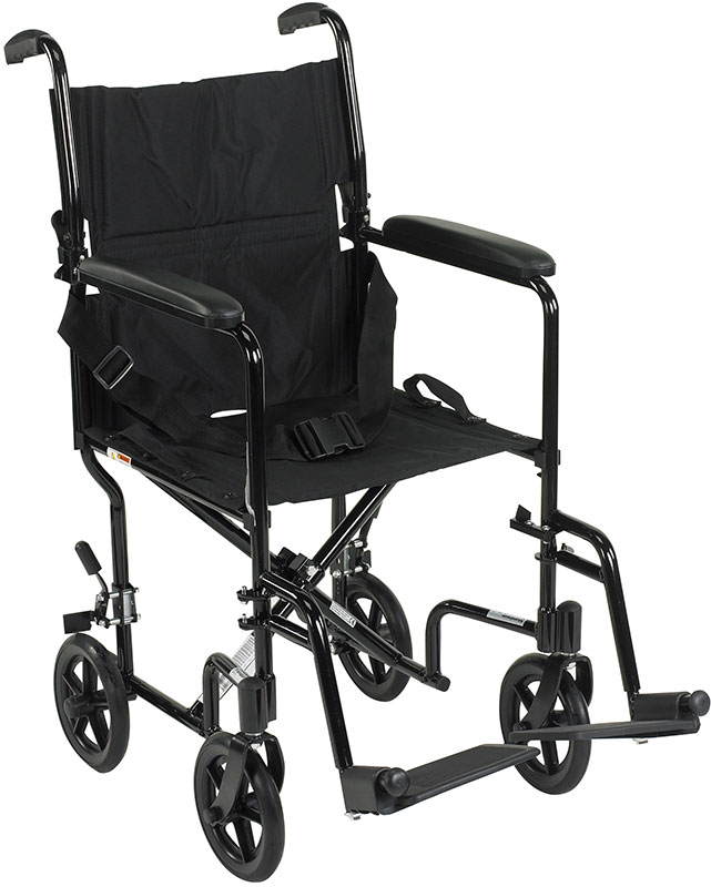 The 17" Aluminum Transport Chair in black by Drive Medical is lightweight and strong, making it easy to transport.