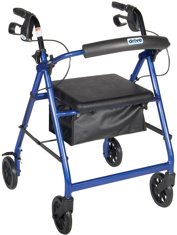 The Rollator with Folding Removable Back Support in blue by Drive Medical comes standard with 6" caster wheels, loop locks and cerated brakes to ensure safety. The seamless padded seat opens to a roomy, convenient, zippered storage pouch to easily and securely transport personal items. The ergonomic handles are easy to grip, relieve hand pressure, and are height adjustable to accommodate users height. Limited lifetime warranty.
