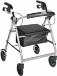 The Rollator with Folding Removable Back Support in green by Drive Medical comes standard with 6" caster wheels, loop locks and cerated brakes to ensure safety. The seamless padded seat opens to a roomy, convenient, zippered storage pouch to easily and securely transport personal items. The ergonomic handles are easy to grip, relieve hand pressure, and are height adjustable to accommodate users height. Limited lifetime warranty.