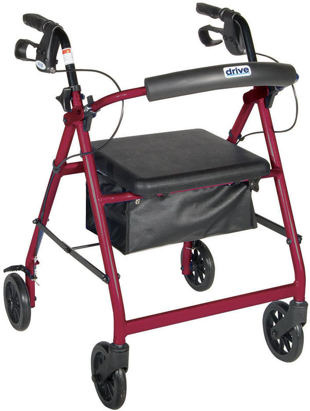 The Rollator with Folding Removable Back Support in red by Drive Medical comes standard with 6" caster wheels, loop locks and cerated brakes to ensure safety.