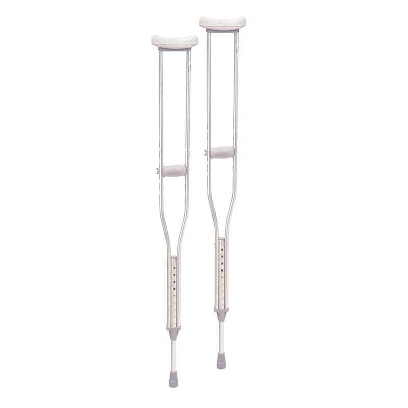 Lighter than wood, the standard aluminum crutch provides stability and durability. Double extruded center tube provides additional strength to weight-bearing areas. Push-pin adjustment makes it easy to adjust crutch height in 1" increments. Non-skid, jumbo size vinyl contoured tips provide excellent traction. Easy wing nut adjustments for hand grips. Comfortable, durable underarm pad and hand grip. 350 lbs. Weight Capacity on aluminum crutch (excluding pediatric). Limited Lifetime Warranty.