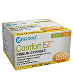 Clever Choice Comfort EZ Insulin Syringes 29G 1/2 cc 1/2" 100/bx - Case of 5 provide the best combination of quality, comfort, and value. The ultra fine, surgical stainless steel needle of the Clever Choice Comfort EZ insulin syringe is coated with a lubricant film for maximum comfort. Design minimizes waste and makes measuring more precise. Easy-to-read graduated numbers minimize dosage errors. Sold in boxes of 100 syringes each.