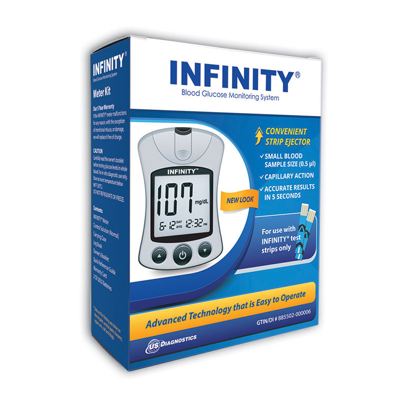 The INFINTY Meter is the newest tool from U.S. Diagnostics for managing your diabetes. The INFINITY® Monitor reads the test strip and automatically sets the code providing easy, safe, quick, and comfortable testing. The Monitor gives you accurate and reliable results in just 5 seconds and it only requires 0.5ul of blood, a tiny sample size. You can now test your blood glucose from your upper arm, forearm, thigh, calf, ventral palm, dorsal hand as well as your fingertips.