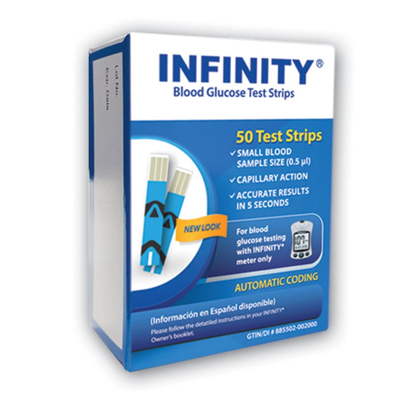 The INFINITY Test Strips (Box of 50) automatically draws blood into the test strip, and shows you if there is enough blood for an accurate reading. INFINITY Test Strips must be used with the INFINITY Blood Glucose Meters for the quantitative measurement of blood glucose level in whole blood. INFINITY Test Strips are for testing outside the body (in vitro diagnostic use only).
