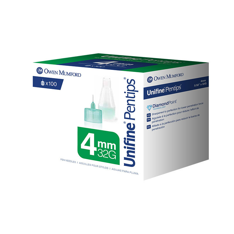 The Unifine Pentips 4mm x 32g by Owen Mumford are triple sharpened and have a unique silicone lubricating coating for maximum comfort. Ref # AN3540. 3 Boxes of 100.