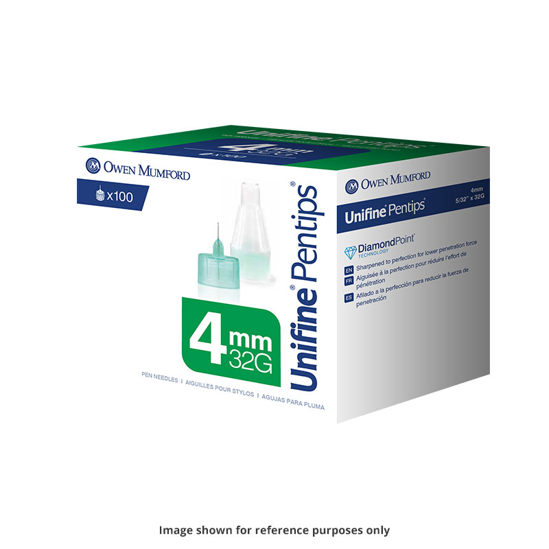 The Unifine Pentips 4mm x 32g by Owen Mumford are triple sharpened and have a unique silicone lubricating coating for maximum comfort. Ref # AN3540. 6 Boxes of 100/bx.