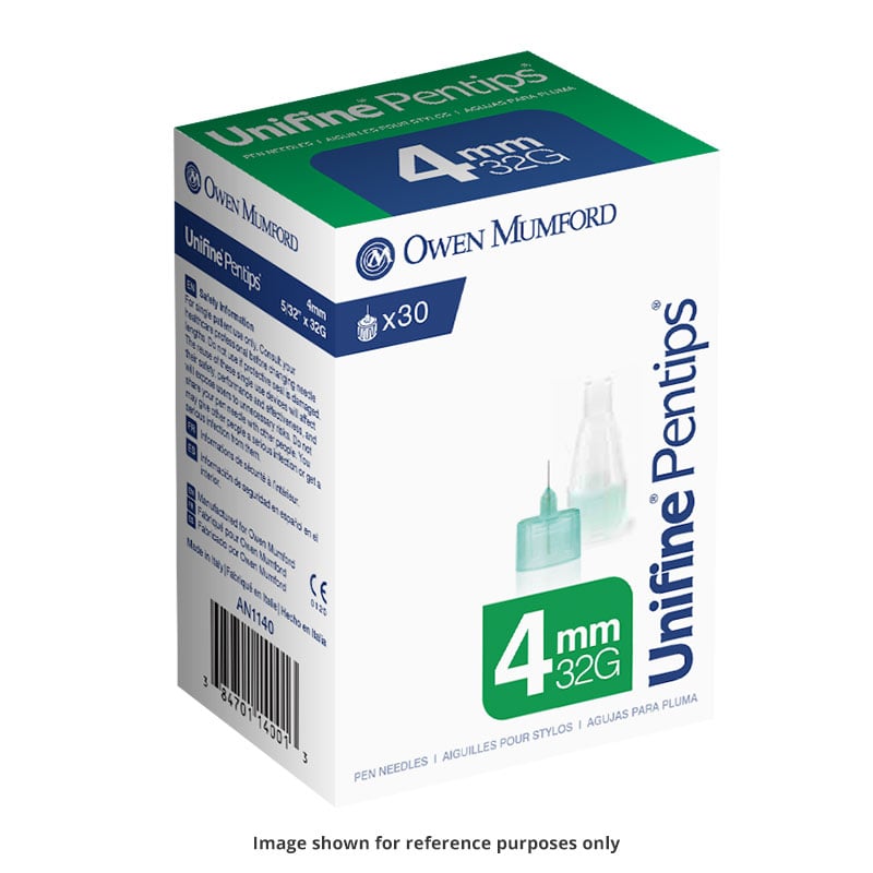 The Unifine 4mm x 32g Pentips by Owen Mumford are triple sharpened and have a unique silicone lubricating coating for maximum comfort. Ref # AN1140. 3 Boxes of 30.