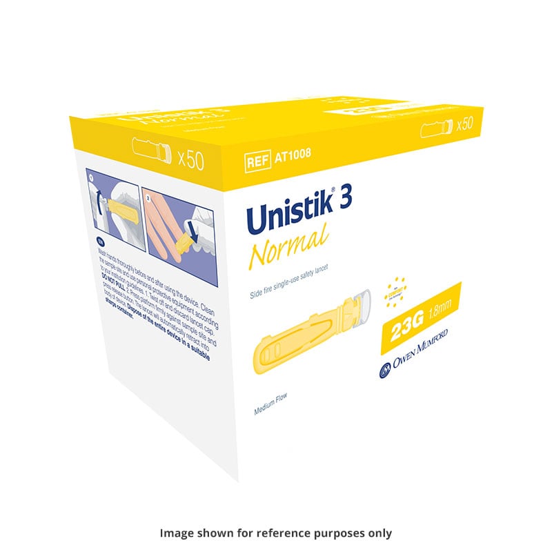 The Owen Mumford Unistik 3 Normal Safety Lancets 50/bx are single use safety lancets. They're preset, just twist off the protective cap and take the sample. Comfort Zone Technology increases comfort by targeting the sensation and perception of pain, masking the pain and increasing comfort. Ref #AT-1007. (23 gauge, box of 50, 3 boxes)