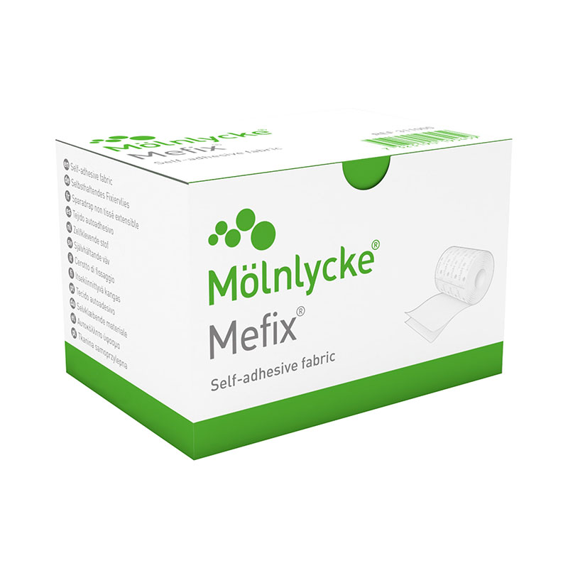 Molnlycke Mefix Tape (8" by 11yd, part number 312000) is designed to be gentle to the skin, while providing secure fixation. It can be used to secure dressings, catheters, and tubes. The fabric is non-absorbent and provides a barrier for blood and fluids.